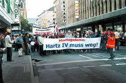 Hartz IV ist ein Gesetz, das die Schröder/Fischer-Regierung beschlossen hat, und das am 1. Januar 2005 in Kraft treten soll. Bisher wurde die Arbeitslosenhilfe entsprechend dem Lohn berechnet, den jemand verdiente, als er noch Arbeit hatte. Schließlich zahlt jeder Arbeiter in eine Arbeitslosenversicherung ein. Mit Hartz IV gibt es statt dieser Arbeitslosenhilfe nun einen festen Betrag, der sich am Niveau der Sozialhilfe orientiert, das so genannte Arbeitslosengeld II (ALG II). Die Regelleistung beträgt in Westdeutschland monatlich 345 Euro, in Ostdeutschland 331 Euro. Hinzu kommt ein individueller Miet- und Heizkostenzuschuss. Eine Familie mit zwei Kindern unter 14 Jahren – ohne weiteres Einkommen – erhält 2 x 90 Prozent des Regelsatzes für die Erwachsenen und 2 x 60 Prozent für die Kinder. (80 Prozent für Jugendliche über 14 Jahren).