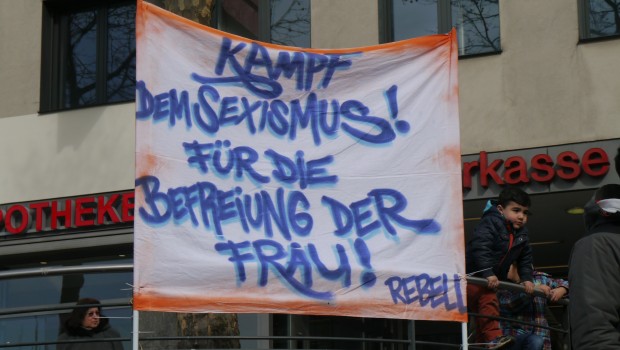 Korrespondenz Köln: Unser Wochenende, ganz im Zeichen des internationalen Frauentags, endet am Sonntag mit einer Kundgebung der DGB Jugend und der DGB Frauen am Kölner Dom. Ca. 70 Frauen beteiligten sich an der Aktion. Sie schrieben in ihrem Aufruf: „Halbnackte Frauenkörper sind in der Werbung und in Medien nach wie vor beliebt. Schluss damit! Hate sexism! Wir haben den alltäglichen Sexismus in dieser Gesellschaft satt. Wir bestimmen selbst über unseren Körper!“ Das Wochenende startete am Freitag, mit einem Frauenempfang des Oberbürgermeisters im Rathaus. Auf dem dortigen „Markt der Möglichkeiten“ präsentieren rund 50 Kölner Frauenorganisationen die Vielfalt ihrer Arbeit. Darunter auch der Frauenverband Courage. Am Samstag rief das kämpferische Frauenbündnis Köln, indem auch der REBELL Köln aktiv ist, zur Kundgebung und Demonstration auf. Unter dem Motto: „Frauen kämpfen internationalen“ wurde besonders der Kampf der Frauen in Rojava zum Thema gemacht. ca. 300 Frauen nahmen an der kämpferischen Aktion teil. Bei Gesprächen auf der Straße, waren dieses Jahr viel mehr junge Frauen, die großes Interesse am internationalen Frauentag zeigten.