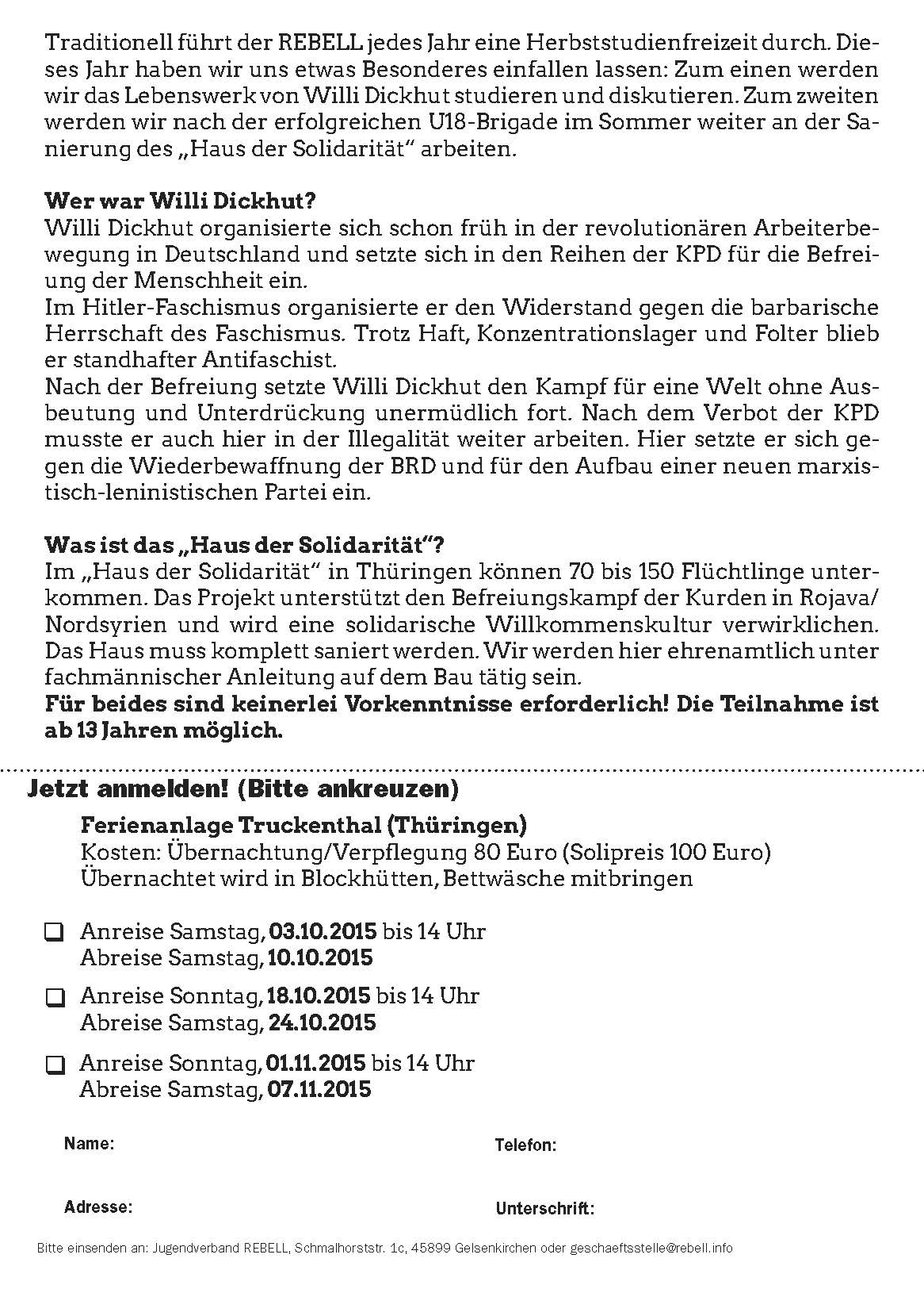 Traditionell führt der REBELL jedes Jahr eine Herbststudienfreizeit durch. Dieses Jahr haben wir uns etwas Besonderes einfallen lassen: Zum einen werden wir das Lebenswerk von Willi Dickhut studieren und diskutieren. Zum zweiten werden wir nach der erfolgreichen U18-Brigade im Sommer weiter an der Sanierung des „Haus der Solidarität“ arbeiten.