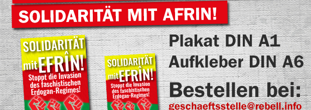 Der Jugendverband REBELL hat aktuell neue Aufkleber und A1-Plakate mit dem Slogan „Solidarität mit Efrin! Stoppt die Invasion des faschistischen Erdogan-Regimes!“ herausgegeben. Ihr könnt sie bei der Geschäftsstelle des REBELL bestellen. Direkt hier oder schreibt eine Mail an: geschaeftsstelle@rebell.info