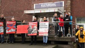 Wir waren von REBELL und MLPD aber noch lange auf dem Platz und tauschten uns mit den Anwesenden aus. Einhellig war die Meinung, dass die Aktion würdelos war. Wir verteilten breit die Pressemitteilung der MLPD „Bisheriger Höhepunkt der faschistischen Terrorwelle – MLPD fordert rigoroses Vorgehen“ und verkauften mehrere Rote Fahnen. Wir sprachen auf den notwendigen Aufbau einer Einheitsfront gegen Faschismus und Krieg an und bekamen von fast allen Zustimmung, dass das nötig sei, egal ob wir nicht in 100% aller Fragen einer Meinung sind.