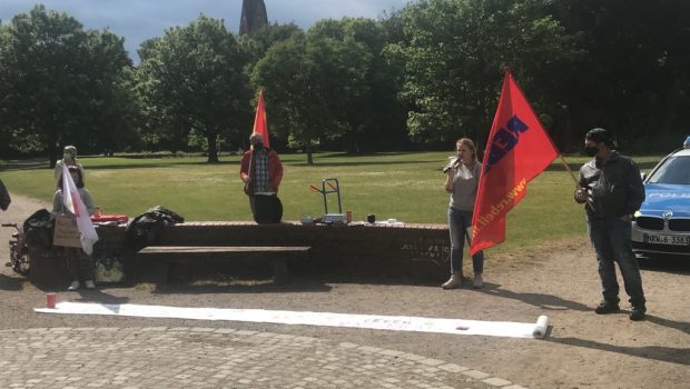 Wir vom REBELL Gelsenkirchen organisierten am Samstag den 06.06. eine Kundgebung „Rebellion gegen Rassismus“ in GE-Buer. Anfänglich schikanierte die Polizei die Kundgebung, zum Beispiel mit der unverschämten Auflage das nur 15(!) Personen erlaubt seien (bei einem sehr großen Platz) und das man den ganzen Platz absperren müsse. Gegen diese Schikanen, gegen eine Kundgebung die sich auch gegen Polizeigewalt richtet, protestierten wir später am Mikrofon. Nach einigen Diskussionen konnten wir aber mehr Teilnehmer durchsetzen und einen Kompromiss zur Abgrenzung finden. Infektionsschutzmaßnahmen sind unbedingt weiterhin richtig, es waren auch Stehplätze auf dem Boden markiert und alle trugen Masken, das lief bei einigen größeren Demos heute nicht so gut. Die Kundgebung startete mit festen 35-40 Teilnehmern und etlichen die aus den Cafés, der Bahnhaltestelle und von Bänken zuhörten. Insgesamt 150 Leute blieben auch (manche kürzer, manche länger) stehen und hörten zu. Wir verteilten insgesamt über 300 REBELL-Flugblätter, viele unser örtlichen REBELL-Programme und luden zur Aufstellung der Lenin-Statue ein. Die meisten Leute waren sehr aufgeschlossen und interessiert, fast keiner hatte nichts von dem ganzen Thema mitbekommen, gerade von den Jugendlichen. Wir haben Kontakt zu einigen neuen Jugendlichen geknüpft, die von der Kundgebung aus Social-Media und der Zeitung erfahren haben. Die WAZ hatte nämlich unsere PM zu der Kundgebung heute noch abgedruckt, das mobilisierte auch noch mehrere ältere Menschen teilzunehmen. Es nahmen auch Kontakte und Freunde die wir bei der Nachbarschaftshilfe kennengelernt haben teil.