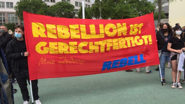 Die MLPD beteiligte sich an der Demonstration mit Fahnen und der Losung „Hoch die internationale Solidarität“ was von den Umstehenden begrüßt wurde. In den Gesprächen mit den vielen Jugendlichen wurde ein Bedürfnis nach einer grundsätzlichen Lösung deutlich und das Interesse an MLPD und Rebell war vorhanden. Viele weitere Bewegungen solidarisierten sich mit der Black lives matter Demonstration und so verbrüderten sich wie selbstverständlich KurdInnen mit der Forderung „Freiheit für Rojava“ mit den Forderungen von „black lives matter“. Besonders eindrücklich war eine Schweigeminute bei der 20 000 Menschen auf die Knie gingen und 8:46 Minuten Stille auf dem weiten Rund einkehrte um an den Mord an George Floyd zu erinnern, stellvertretend für jede rassistische Gewalt.