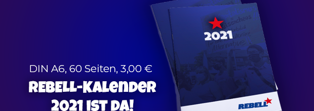 Passt in die Hosentasche, macht Vorfreude auf ein rebellisches Jahr 2021 und hilft ungemein beim Organisieren und Planen… Der REBEL-Kalender 2021! Bestellungen an geschaeftsstelle@rebell.info oder 0209 9552448 Grafik: Jugendverband