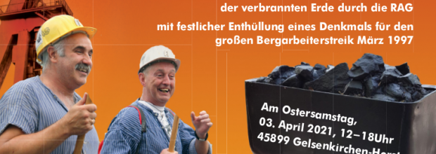 Kumpel für AUF und AUF Gelsenkirchen laden ein: zum Protest gegen die Politik der verbrannten Erde durch die RAG Hier gibt es die gestaltete Einladung mit festlicher Enthüllung eines Denkmals für den großen Bergarbeiterstreik März 1997 Am Ostersamstag, 03. April 2021, 12-18Uhr 45899 Gelsenkirchen-Horst 12 Uhr: Demonstration, Auftakt am Marktplatz Horst-Süd … Denkmal für den großen Bergarbeiterstreik im März 1997 weiterlesen