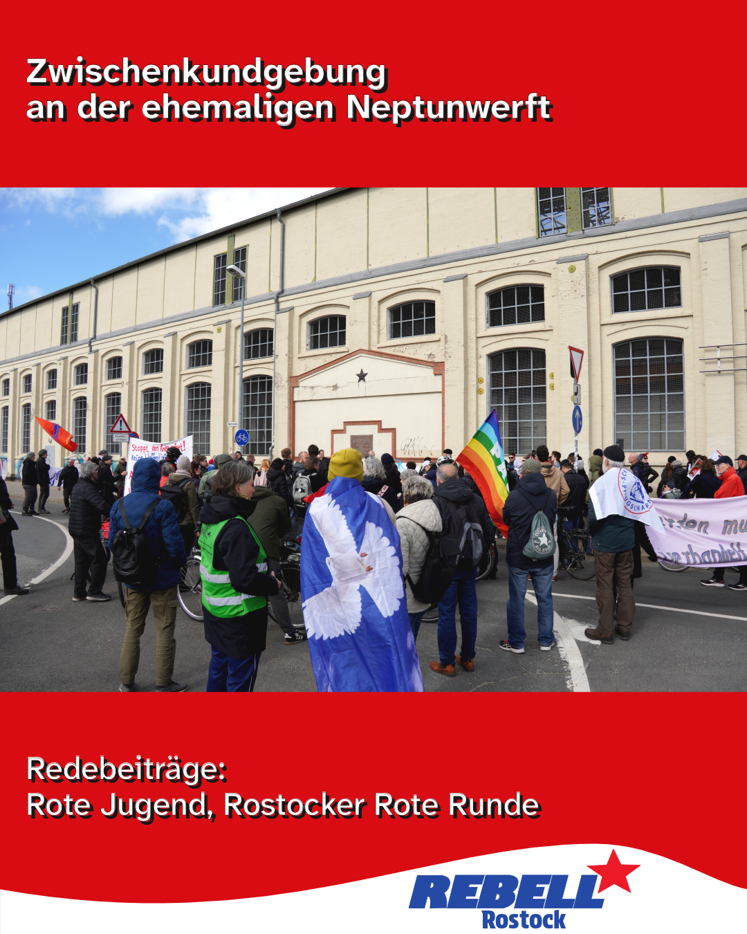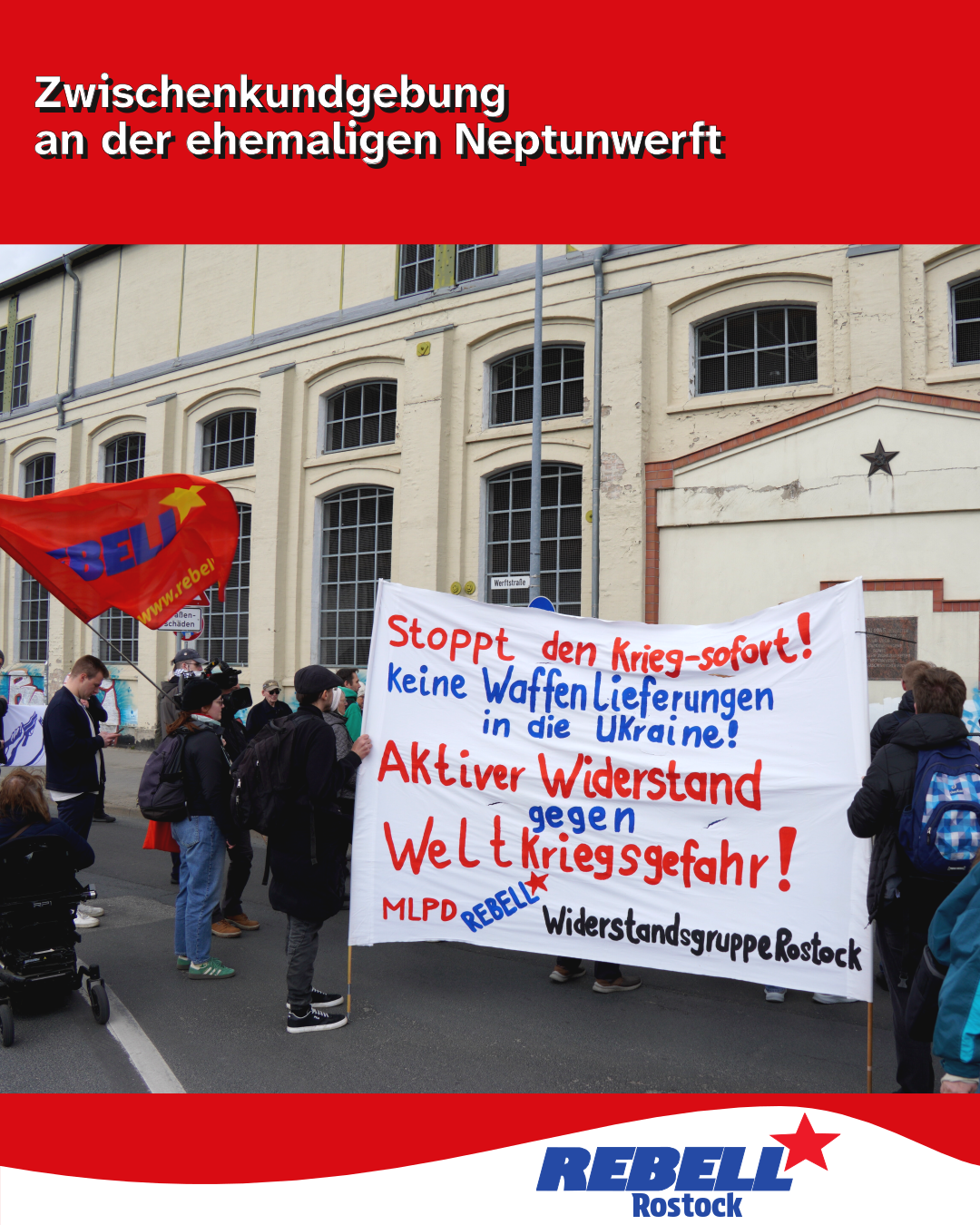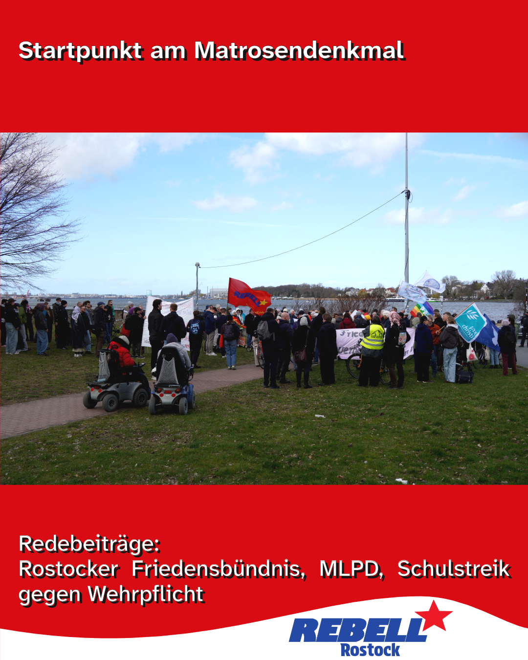 Der Ostermarsch wurde dieses Mal von einem breiteren Bündnis aus mindestens acht überwiegend linken Organisationen, Parteien und Gruppen organisiert. Neben uns vom REBELL nahmen auch andere Jugendorganisationen teil, wie z. B. die „Rote Jugend“ und Jugendliche aus der Bewegung „Schulstreik gegen Wehrpflicht“. Entsprechend waren auch die Redebeiträge und Vorstellungen für den Weg zum Frieden vielseitig und beschränkten sich nicht nur auf die zunehmende Militarisierung von Rostock mit seinem Marinestützpunkt und Ausbau des Seehafens zum Umschlagsplatz für Waffen und Truppen im Ostseeraum. Kritisiert wurden auch die maßlose Aufrüstung und die davon ausgehende Weltkriegsgefahr durch die zahlreichen imperialistischen Kriege wie in der Ukraine und jetzt im Iran.