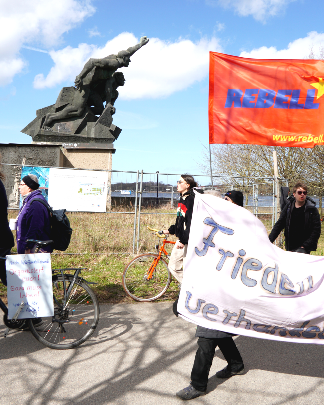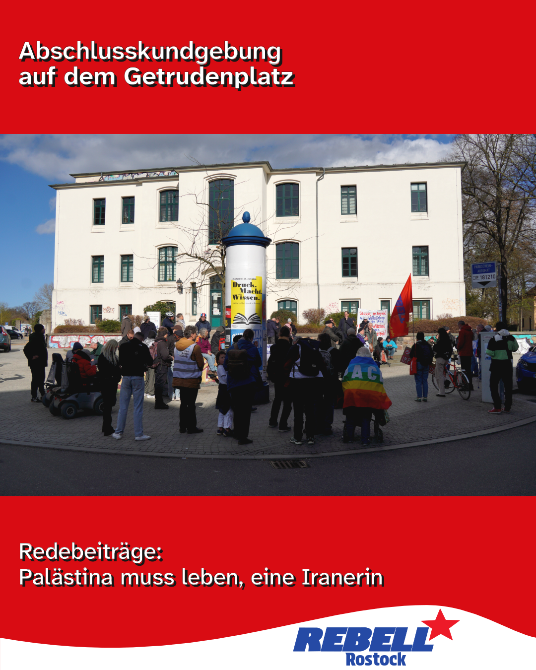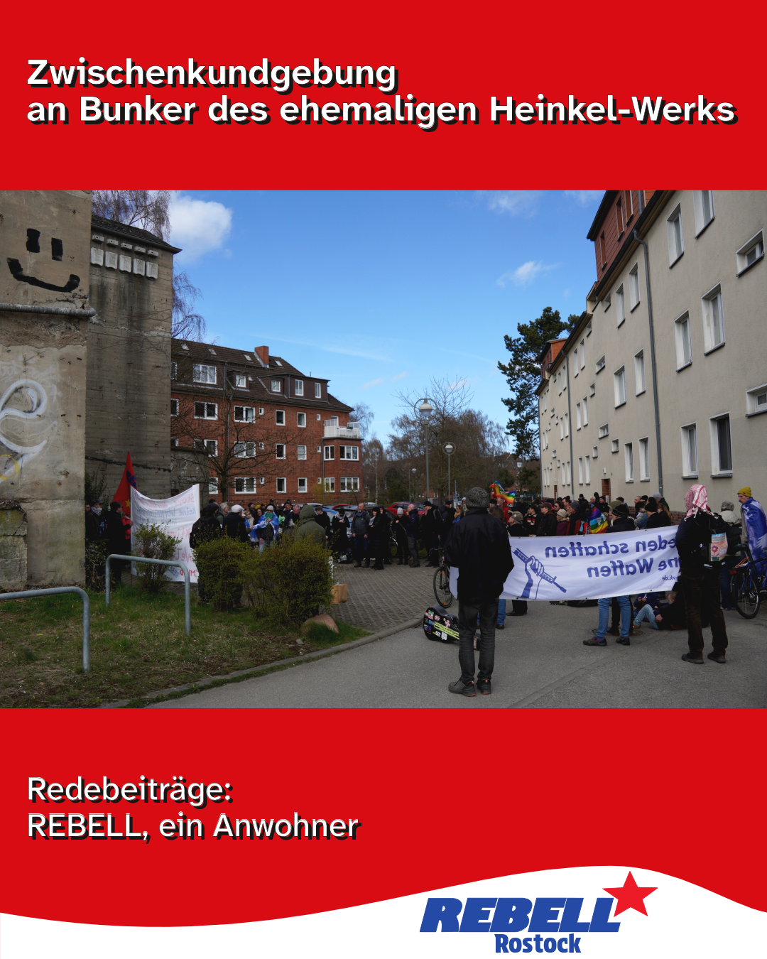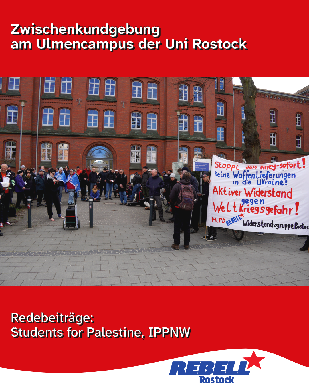 Der Ostermarsch wurde dieses Mal von einem breiteren Bündnis aus mindestens acht überwiegend linken Organisationen, Parteien und Gruppen organisiert. Neben uns vom REBELL nahmen auch andere Jugendorganisationen teil, wie z. B. die „Rote Jugend“ und Jugendliche aus der Bewegung „Schulstreik gegen Wehrpflicht“. Entsprechend waren auch die Redebeiträge und Vorstellungen für den Weg zum Frieden vielseitig und beschränkten sich nicht nur auf die zunehmende Militarisierung von Rostock mit seinem Marinestützpunkt und Ausbau des Seehafens zum Umschlagsplatz für Waffen und Truppen im Ostseeraum. Kritisiert wurden auch die maßlose Aufrüstung und die davon ausgehende Weltkriegsgefahr durch die zahlreichen imperialistischen Kriege wie in der Ukraine und jetzt im Iran.