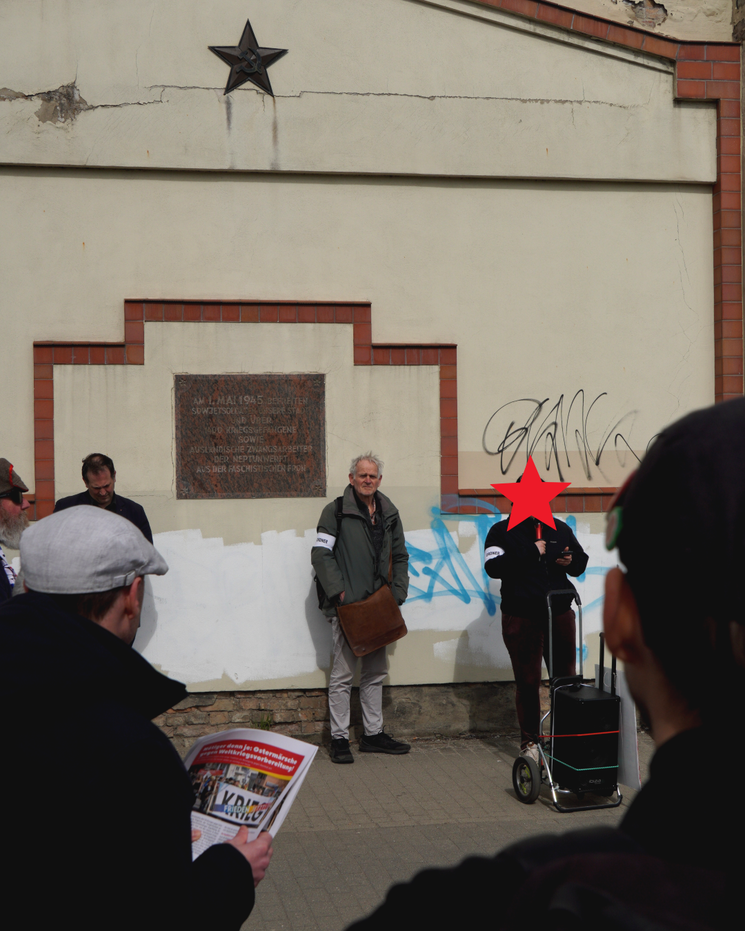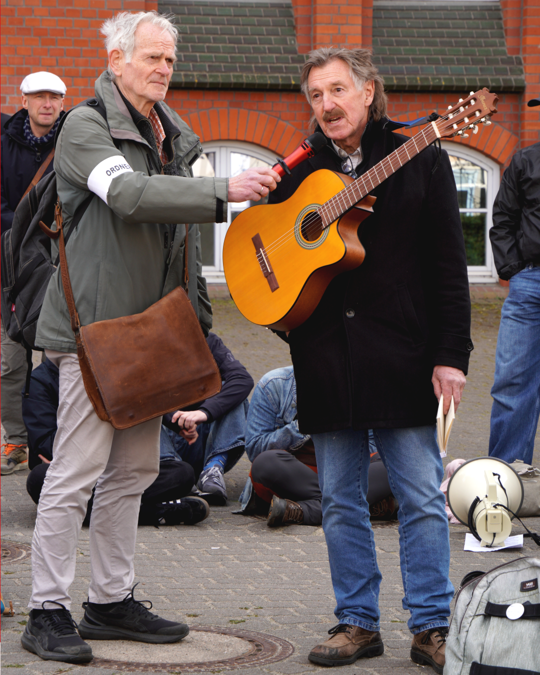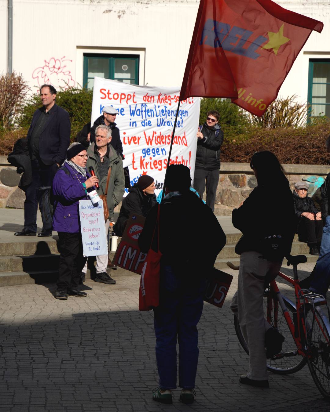 Eine Schülerin vom Schulstreik gegen Wehrpflicht griff die Bundesregierung an, die Milliarden an Geldern in Waffen stecke statt in Klimaschutz, Bildung und Infrastruktur: „Pistorius will Kriegstüchtigkeit, wir wollen Frieden“, sagte sie. Ein Vertreter der IPPNW1 zeigte die aktuelle Bedrohung durch die neue Atomrüstung auf, die ungleich größer sei als in den Hochrüstungszeiten der 80er Jahre. Eine Iranerin verurteilte den völkerrechtswidrigen Angriffskrieg der USA und Israels gegen den Iran. Er diene keineswegs die Befreiung der Menschen, sondern treffe vor allem Frauen und Mädchen, wie die Bombardierung einer Mädchenschule zeige. Sie rief zum gemeinsamen Kampf der Völker des Nahen Ostens gegen die Kriegstreiber auf. Auch MLPD und REBELL ergriffen das Wort, riefen zur weltweiten Front gegen Faschismus, Krieg und Umweltzerstörung auf und propagierten die vereinten sozialistischen Staaten der Welt als einzige Alternative zum Untergang der Menschheit in einem dritten Weltkrieg.