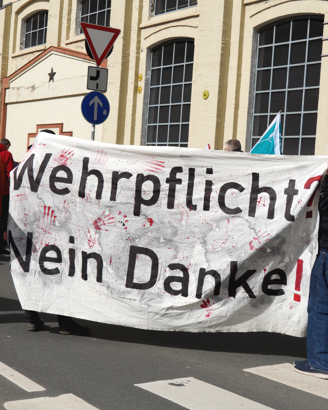 Im Gegensatz dazu positionierte sich das Rostocker Friedensbündnis klar antifaschistisch und rief auf, ein Zeichen für Entmilitarisierung, Klimaschutz und Nachhaltigkeit sowie grenzenlose Solidarität zu setzen. 170 Leute, etwa die Hälfte Jugendliche, zogen kämpferisch und lautstark durch die Stadt. Sprechchöre wie „Die Reichen wollen Krieg, die Jugend eine Zukunft! – NEIN zur Wehrpflicht! – Deutsche Waffen, deutsches Geld morden mit in aller Welt! – Hoch die internationale Solidarität!“ wurden immer wieder skandiert.