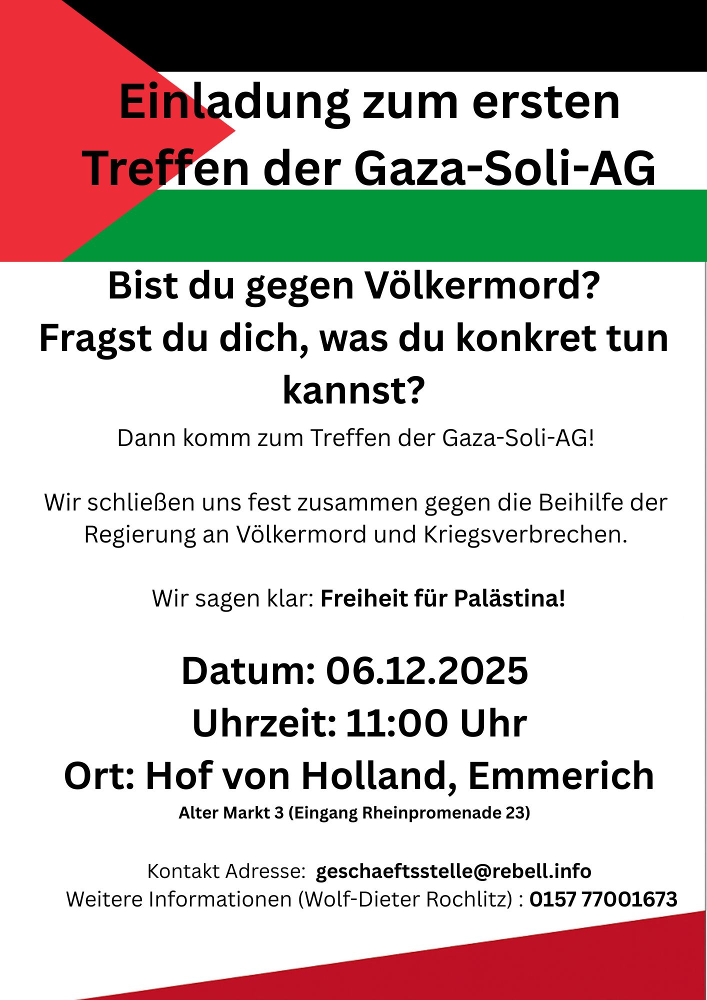 Am 6. Dezember 2025 hat sich die Gaza-Soli-AG in Emmerich am Rhein gegründet. Die Idee dafür hatten einige von uns vor kurzem geboren. Wir trafen…